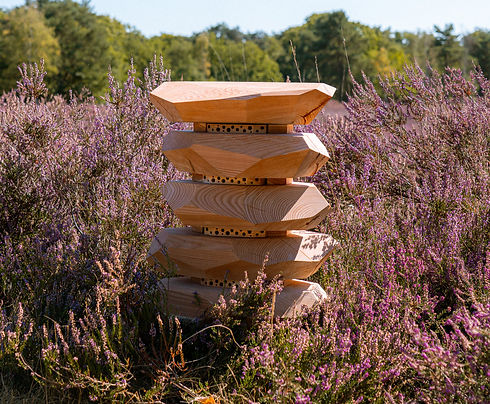 Het aantal solitaire bijen in de natuur neemt drastisch af. Een zorgwekkende ontwikkeling, want de wilde bijen zijn onmisbaar voor onze voedselvoorziening en biodiversiteit. Daarom zochten wij naar een originele manier om natuurbehoud en biodiversiteit te stimuleren. Zo hebben wij, in samenwerking met een ontwerpersduo uit Breda, larikshouten sculpturen ontworpen die wilde bijen een veilige nestelplaats bieden én die er ook nog eens prachtig uitzien. Een aanwinst voor je (bedrijfs)tuin en een win-winsituatie voor mens en natuur.